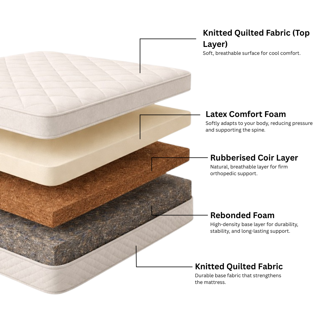 A premium eco-friendly mattress combining natural latex, breathable coir, and durable rebonded foam. Soft, cool, and supportive.